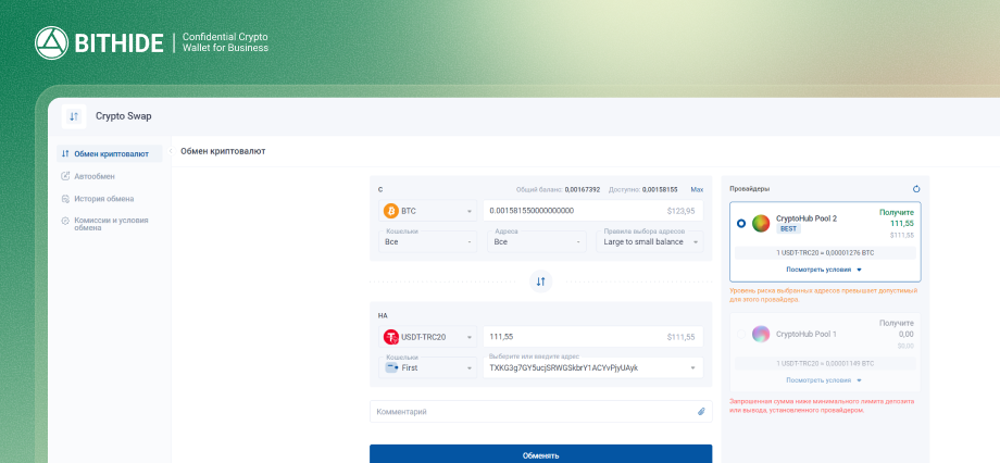 В BitHide появился отдельный плагин для быстрого обмена криптовалют прямо внутри сервиса. Вы выбираете монеты, сумму и адрес, создаёте заявку и ждёте зачисления. Плагин сразу показывает все комиссии, считает итоговую сумму и подсказывает актуальные курсы.