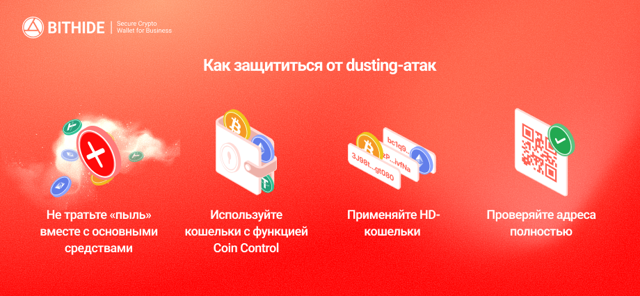 Самое важное правило: не включайте подозрительные dust-входы в свои транзакции. Если «пыль» останется нетронутой, атакующие не смогут связать ваши адреса.