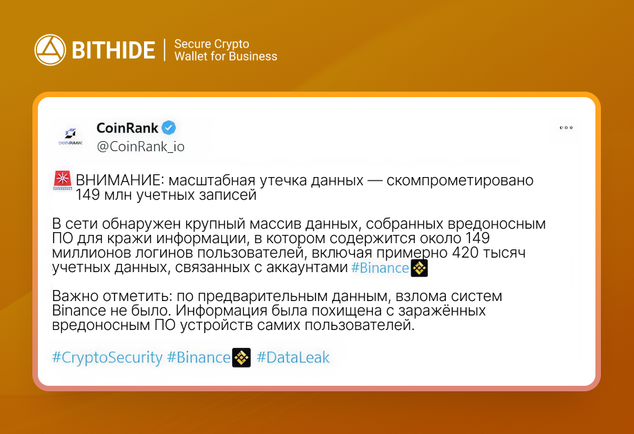 - Инцидент начался с открытой базы данных, а не со взлома сервиса — 149 млн учётных записей, включая около 420 000, связанных с Binance, были собраны вредоносным ПО с устройств пользователей.