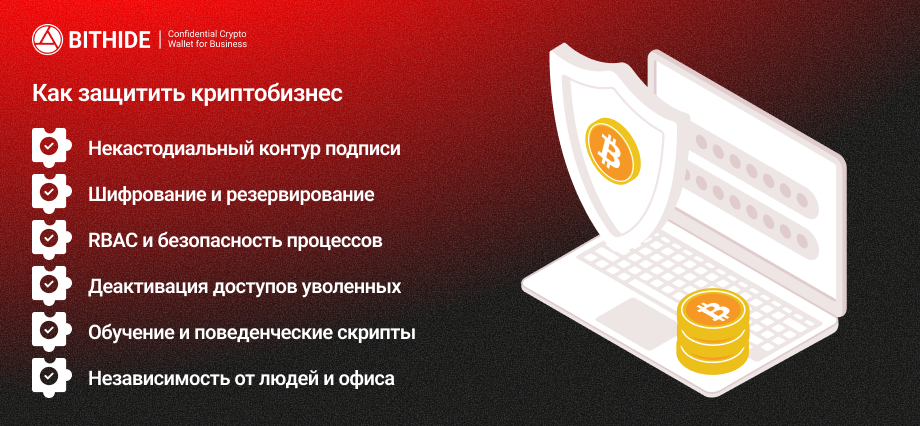 Ключевым фактором устойчивости стала некастодиальная архитектура BitHide и строгая операционная дисциплина. Ниже — то, что позволило бизнесу остаться на плаву, даже после физического захвата офисных устройств: