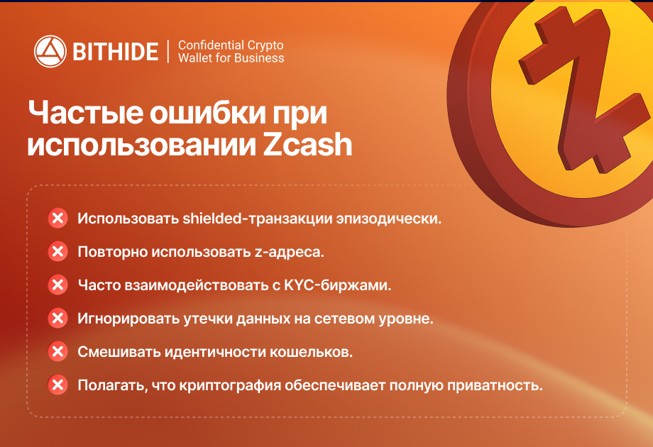 Повторное использование одного и того же z-адреса или отправка предсказуемых сумм создает узнаваемые паттерны. Это ослабляет приватность, обеспечиваемую zk-SNARKs, и облегчает деанонимизацию для хакеров и аналитиков.