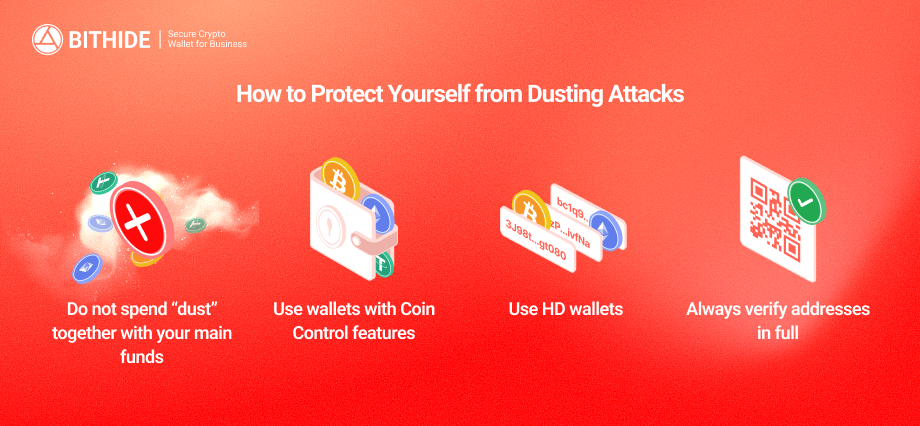 - Errors provoked by «dust» transactions have already led to losses of hundreds of thousands and tens of millions of dollars. Protection is built on control and discipline. Not using dust inputs, checking addresses and using wallets with extended control significantly reduces risks, especially in corporate environments.