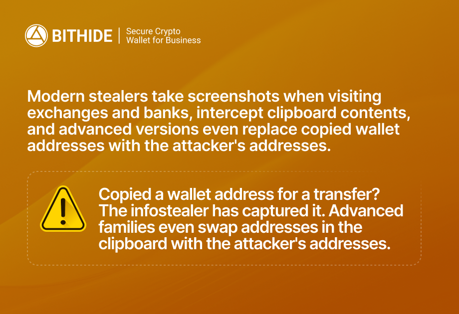 For the crypto industry, this is especially critical. Binance account hack, the causes of which often lie in compromised devices, can lead to loss of funds within minutes with no possibility of rollback or freezing. Data theft through malware happens unnoticed: Infostealer collects passwords from browsers, intercepts session tokens, and transfers them to attackers.