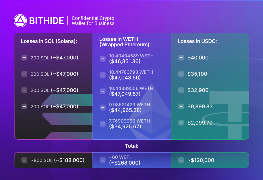 The attack began on September 16, 2025, at 11:21 UTC. Funds were withdrawn in large transactions within a narrow time window and distributed across multiple addresses. Here is a detailed breakdown of the user’s losses by blockchain and transaction.
