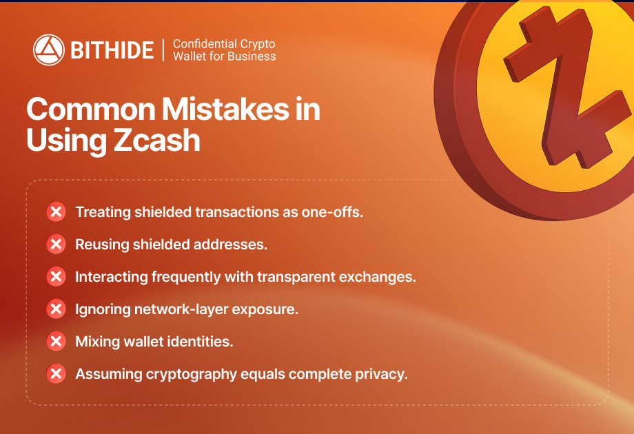 Despite its zk-SNARK technology, Zcash’s privacy is limited by ecosystem practices and user behavior. Most transactions default to transparency, making wallets and financial flows traceable. To protect assets and sensitive operations from malicious actors, consistent shielded transactions, address rotation, network-layer obfuscation, and operational separation are required.