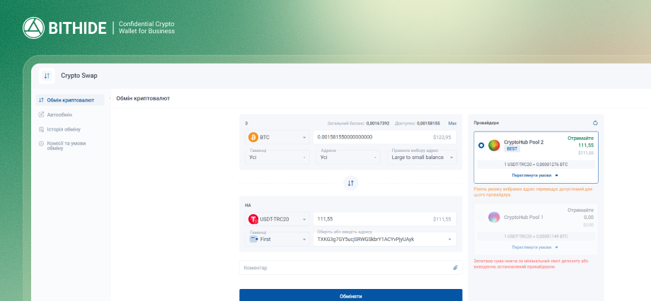 У BitHide з'явився окремий плагін для швидкого обміну криптовалют прямо всередині сервісу. Ви обираєте монети, суму та адресу, створюєте заявку і чекаєте зарахування. Плагін одразу показує всі комісії, рахує підсумкову суму та підказує актуальні курси.