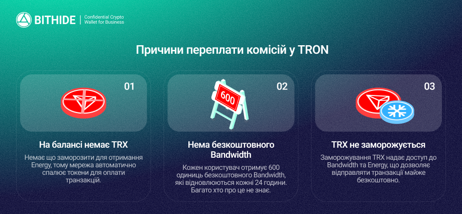 Проблема в тому, що більшість людей просто не знають, як працює система ресурсів у TRON. Вони відправляють USDT TRC-20, бачать списання комісії у TRX і вважають це нормою. Є кілька причин переплат.
