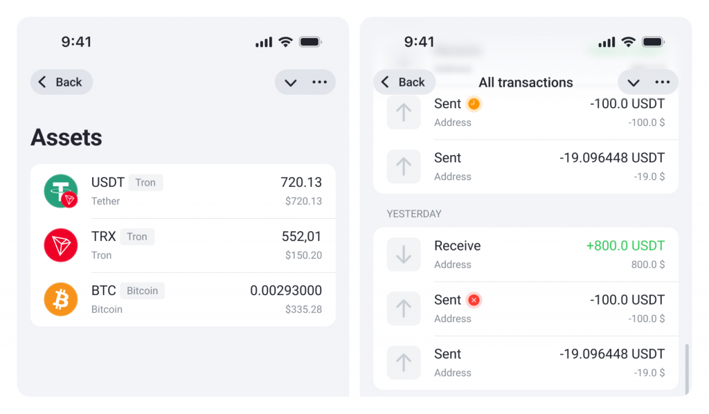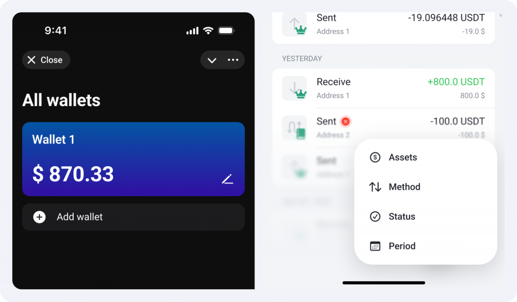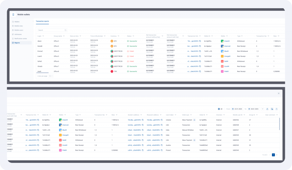 • Історія транзакцій – фільтри за валютою та адресою, зручний пошук і автопідвантаження під час прокручування.