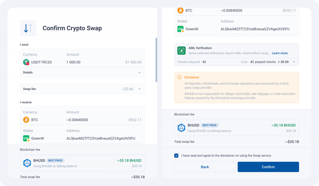 Важливо: для обміну використовуються лише адреси, які відповідають AML-критеріям – загальний ризик не вище 75% і частка коштів із High Risk категорій не більш як 10%.