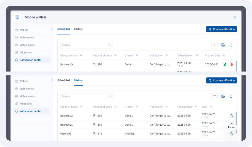 • Історія – переглядайте надіслані сповіщення та за потреби запускайте повторну відправку.