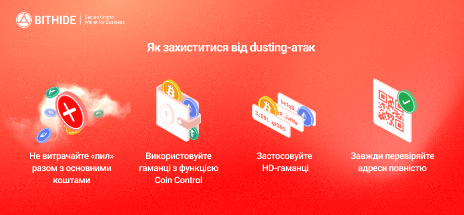 Найважливіше правило: не включайте підозрілі dust-входи у свої транзакції. Якщо «пил» залишиться недоторканим, атакуючі не зможуть зв'язати ваші адреси.