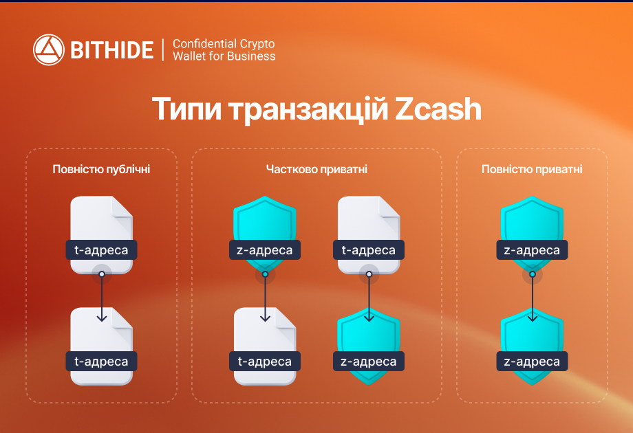 • z-адреси (shielded) — приватні, де zk-SNARKs приховують усі деталі транзакції.